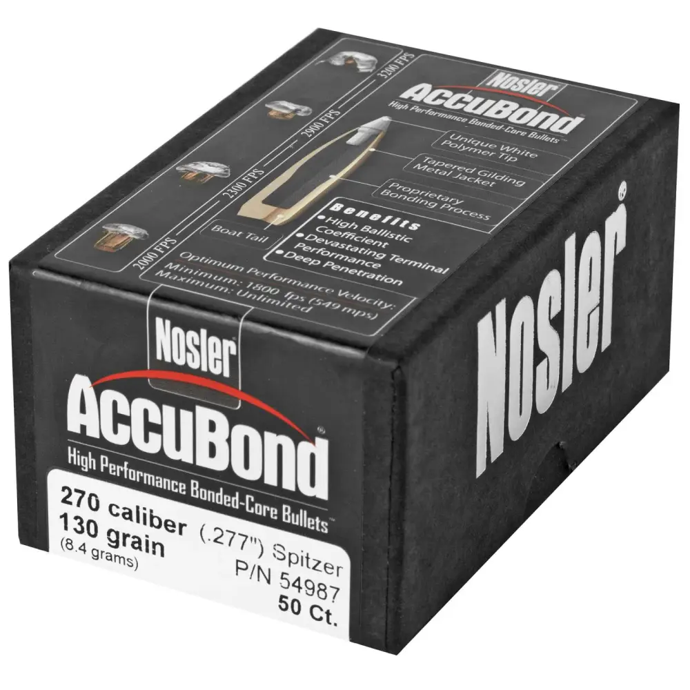 Through an exclusive bonding process that eliminates voids in the bullet core, AccuBond couples Nosler's proven copper-alloy jacket with its special lead-alloy core. The result is a bullet that flies true, penetrates deep and retains its weight, without causing extensive barrel fouling. The unique white polymer tip resists deforming and initiates expansion on impact. Nosler's Solid Base at the rear of the bullet acts as a platform for large diameter mushrooms.