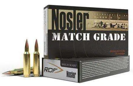 Match Grade-RDF ammunition brings all of the ballistic advantages of the RDF bullet line to loaded ammunition. Designed specifically for long range competition, the RDF bullets feature highest in class BC's and incredibly small meplats for consistent precision and flat trajectory at long range. Loaded in premium Nosler brass, Match Grade-RDF ammunition is carefully loaded with precise, high-performance powder charges for accuracy and consistency that competitors can depend on.