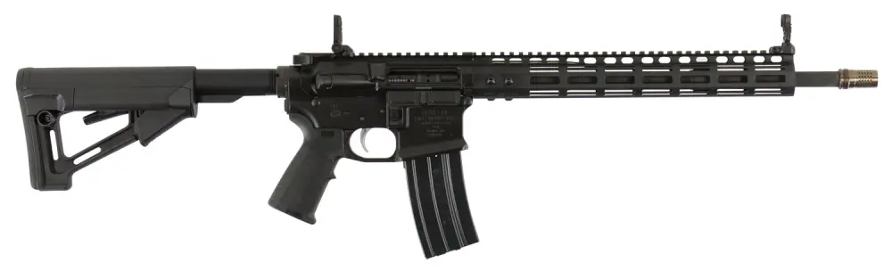 This Light Recce Gen3 M-Lok rifle features a 16" chrome-lined barrel with a cherry bomb muzzle break, a Gen3 7075 T-6 aluminum receiver with a black armor cerakote finish, black Magpul Miad pistol grip, a black Magpul STR stock, and Magpul MBUS Pro folding sights.