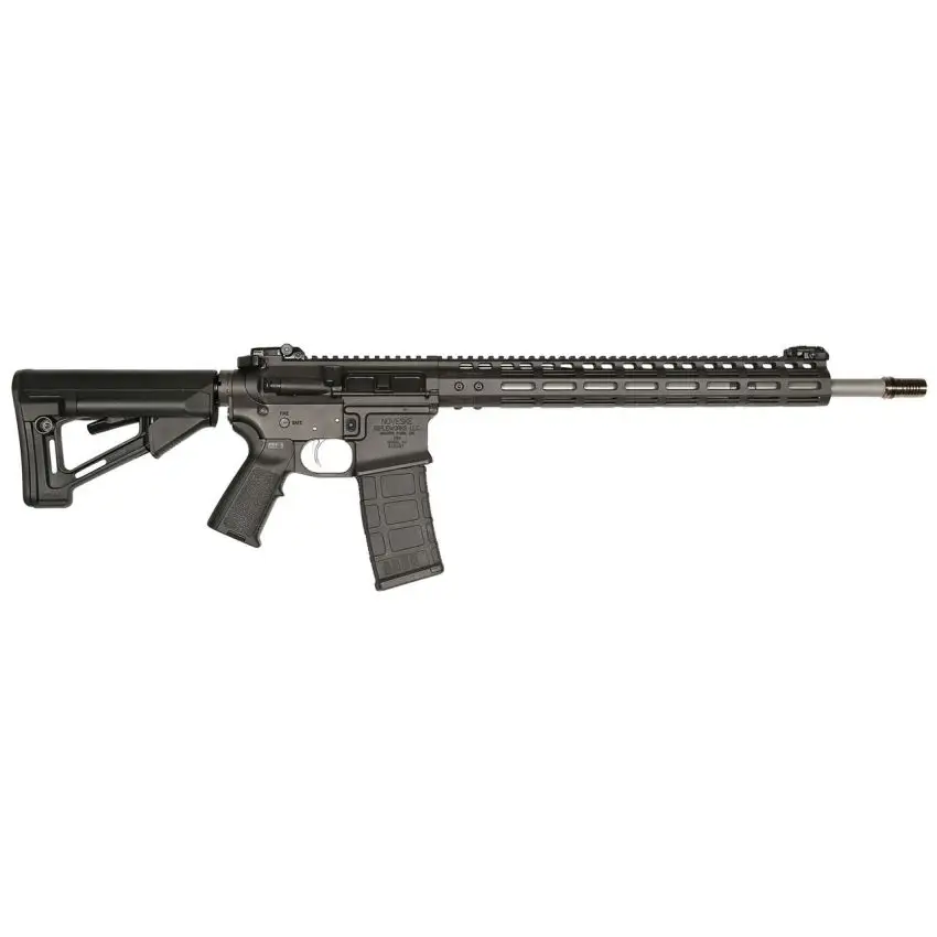 This SPR M-Lok Gen3 rifle features a 18" stainless steel barrel with a cherry bomb muzzle break, a Gen3 7075 T-6 aluminum receiver with a black armor cerakote finish, black Magpul Miad pistol grip, a black Magpul STR stock, and has Magpul MBUS Pro folding sights.