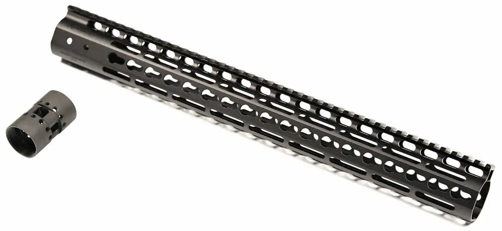 This NSR (Noveske Skinny Rail) features a 6005-T6 aluminum construction with a black hardcoat anodized finish, a 1913 continuous top and bottom rail, and a keymod direct attachment system. It comes with a barrel nut, mounting screws, and a T25 wrench.