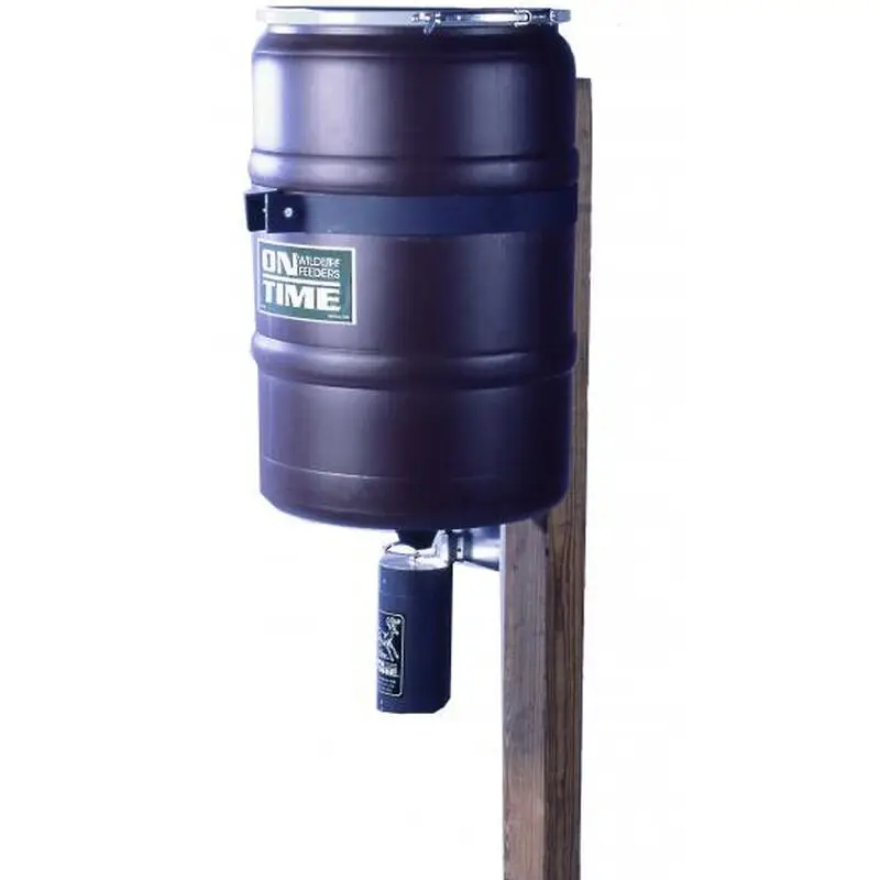 On Time's Elite Fish Feeder Combo comes with a 150 lb capacity hopper, a steel attachment band with welded brackets. This unit is designed to dispense round and cylindrical fish food. It features a large-scale motors with agitator rods that extend into the hopper and a deflector plate that allows for directional feeding.