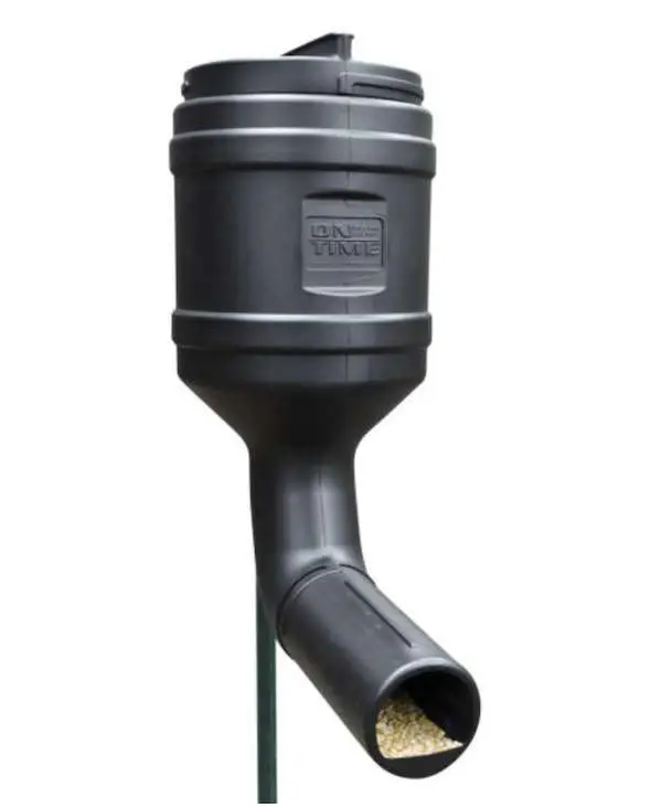 The Gravity T-Post from On Time is a gravity driven feeder and has an 80 pound capacity, and does not require a motor to work.