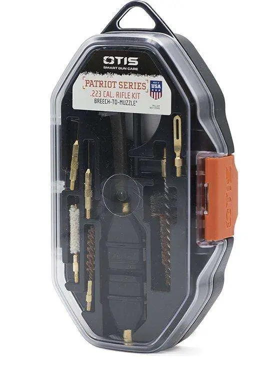Otis' Patriot Cleaning Kit offers the essential firearm maintenance gear to properly clean from Breech-to-Muzzle. Included is a Memory-Flex cable, slotted tip, bore mop, caliber-specific bronze bore brush which removes deposits and other fouling, a t-handle and driver tool for the included four bits, double-ended AP (All Purpose) brush, chamber brush, rod, as well as curved and straight locking lug picks for proper cleaning of the chamber.