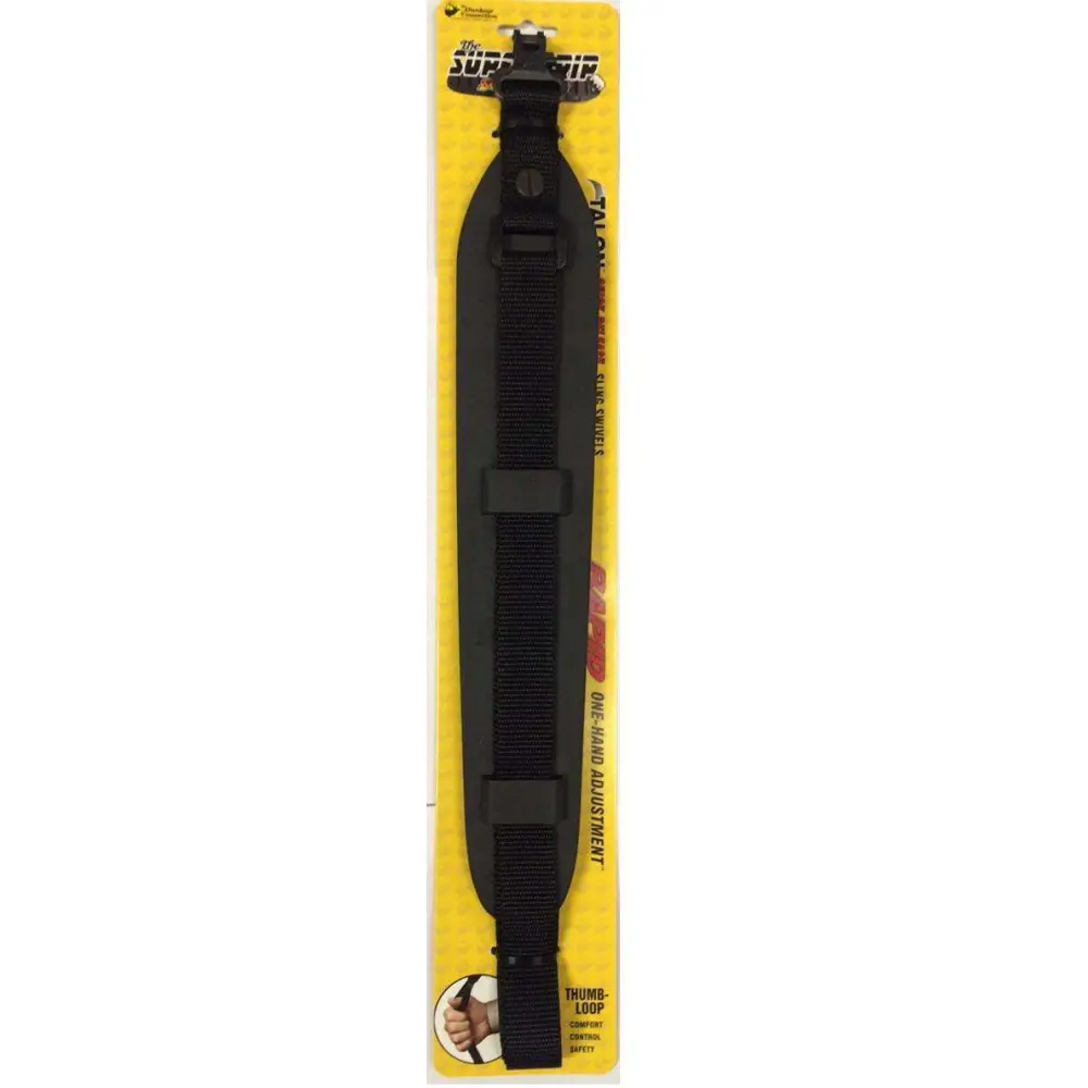 Outdoor Connection's Super Grip Slig installs easily onto existing swivel bases and has a rapid one-hand adjustment. It locks into position for extra stability and the rubber shape conforms and has a resilient non-slip pad that molds to the shape of your shoulder. This sling features a Mil-Spec type webbing, Talon Quick-Release detachable swivels, and integral thumb-loop for comfort and control when carrying firearm.