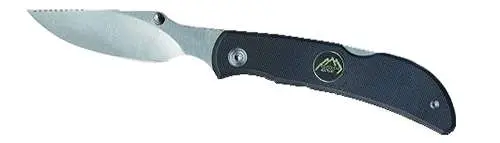The blade of this knife has a texture notched thumb rest and dual thumb studs for ambidextrous one hand opening. The black G10 handle knife, 4 1/8" closed, has stainless steel liners, inlaid shield, and a lockback. A removable metal pocket clip is mounted at the butt end of this knife.