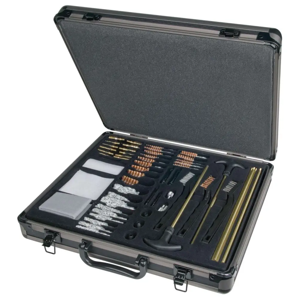 The latched 62pc Universal Aluminum cleaning kits provide the ultimate in convenience, durability and portability with the custom parts organizer. This product line also includes an eco-friendly option for hunters and shooters with its odorless, non-irritating, gun care system. This kit includes-3 solid brass rods for .17-270-cal rifles and pistols; 3 solid brass rods for 30-cal and larger rifles, pistols and shotguns and muzzleloaders; 14 Bronze brushes to fit: 17-cal, 2.20/204 cal, 22-cal, 243-25 cal/6mm, 6.5mm, 270/7mm-cal, 30/8mm-cal, 9mm/38/357-cal, 40-45-cal/10mm, 410-ga, 20/28-ga, 10/12-ga, 50 cal and 54 cal; 9 mops to fit: 17 cal, .22-25/6mm/6.5mm-cal, .270-30 cal/7mm, 8mm, .38-357/9mm-cal, .40-.45/10mm cal, 410-ga, 20/28-ga, 10/12-ga, .50-.54 cal; 6 spear pointed jags to fit: 17-cal, 22-cal, .270/7mm cal, .30-32-cal, 35-cal/9mm, .40-45-cal/10mm; 13 Spear pointed brass Jags to fit: 17-cal, 22-cal, 6mm, 25-cal/6.5mm, 270-cal/7mm, .30-32-cal, 338-cal/8mm, 35-cal/9mm, 375-cal, 40-cal, 44-cal, 45-cal, 50-cal; 13 Spear pointed brass Jags to fit: 17-cal, 22-cal, 6mm, 25-cal/6.5mm, 270-cal/7mm, .30-32-cal, 338-cal/8mm, 35-cal/9mm, 375-cal, 40-cal, 44-cal, 45-cal, 50-cal; 4 Slotted patch loops to fit: 22-cal, 30-cal, 410-20/28-ga, 10/12-ga; 3 Utility brushes; 3 Muzzle guards to fit: 17-cal, 22-cal, 30-cal; 3 accessory adaptors for rifle/pistol, shotgun and muzzleloader; 50 Cleaning patches 3" x 1.5"; 50 Cleaning patches 3" x 3" and 4 Polishing cloths.