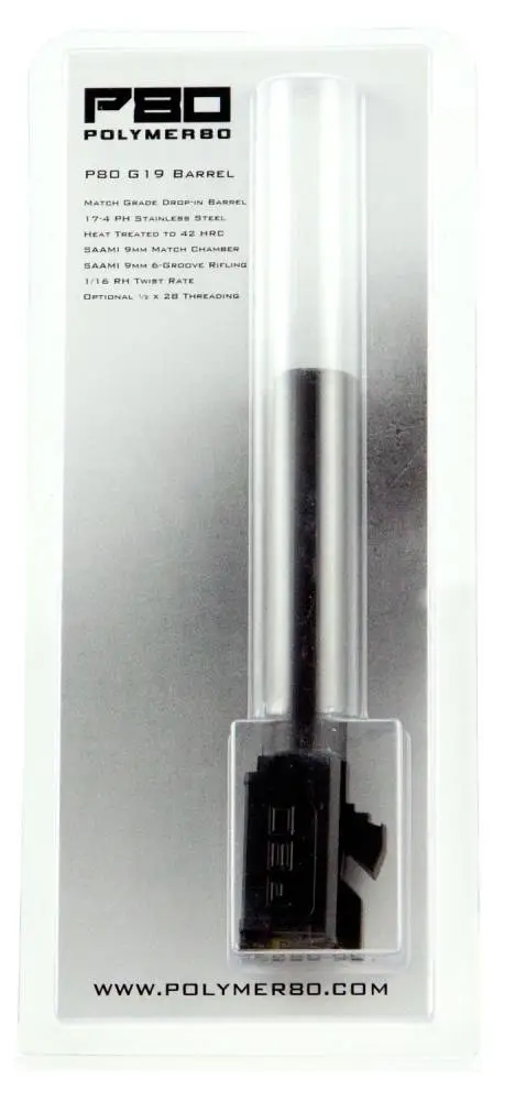 The P80 line of G19-compatible barrel is precision CNC machined from 17-4 PH stainless steel. The match grade drop-in barrel is heat treated to 42 HRC with 1:16 rate of twist and is compatible with PF-Series compact frame and Glock 19 9mm Gen1-4.