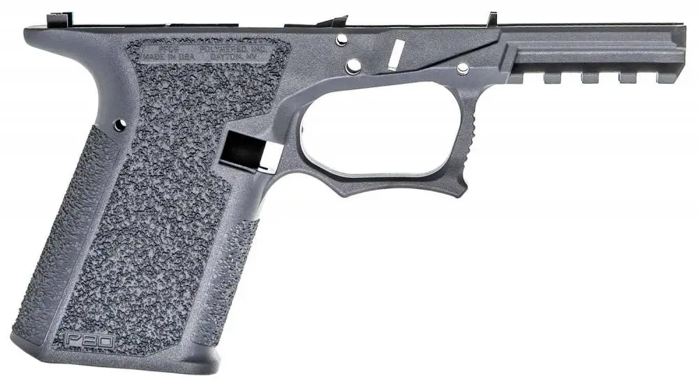 Polymer80's PF9C Serialized Compact Pistol Frame offers compatibility with Glock 19/23 Gen3 components, and is an industry first. Features such as the extended beaver tail, double undercut trigger guard, and a thumb ledge considerably enhance the ergonomics allowing for an effective grip and improved recoil mitigation. The frame is constructed of a high-strength reinforced polymer with a Picatinny/STANAG compliant accessory rail. This model has a gray finish and features an aggressive and adaptable grip texture.