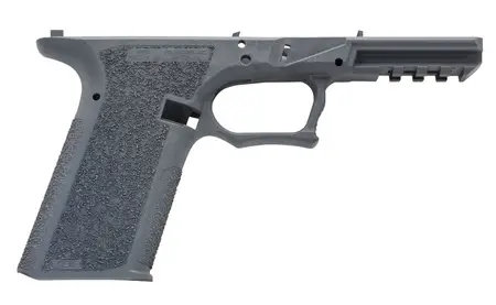Polymer80's PF9S Serialized Compact Pistol Frame offers compatibility with Glock 17/22 Gen3 components, and is an industry first. Features such as the extended beaver tail, double undercut trigger guard, and a thumb ledge considerably enhance the ergonomics allowing for an effective grip and improved recoil mitigation. The frame is constructed of a high-strength reinforced polymer with a Picatinny/STANAG compliant accessory rail. This model has a gray finish and features an aggressive and adaptable grip texture.