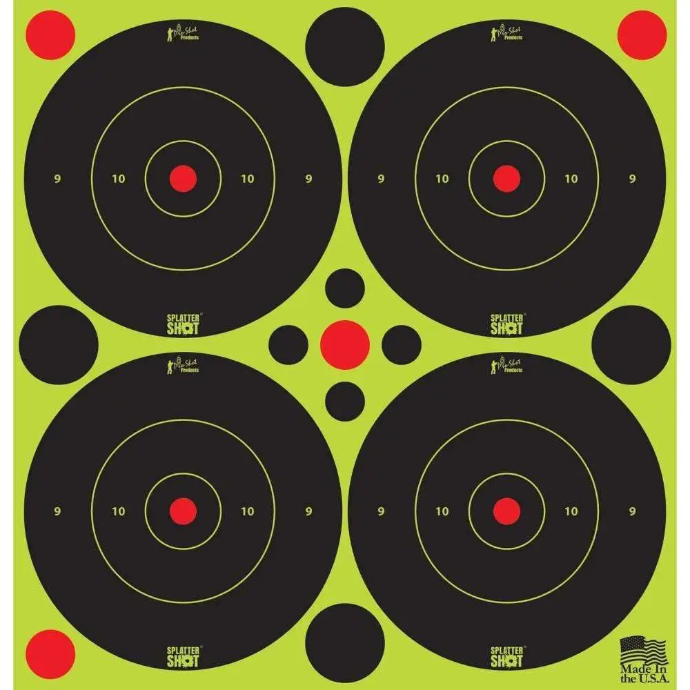 Pro-Shot's SplatterShot Peel and Stick target is printed and made in the USA. This target features a bullseye illustration and each sheet comes with four (4) 3" Peel & Stick targets. (48 total Peel & Stick targets)