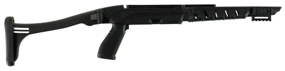 Made in the USA, this lightweight folding stock for the Remington Model 597 .22 LR/.22 WMR rifle features a pistol grip with storage compartment, Picatinny tri-rail forend, positive locking side folding stock with rubber recoil pad.