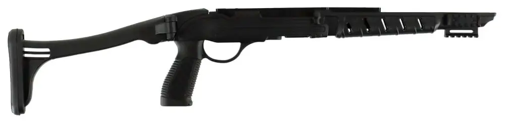 Made in the USA, this lightweight folding stock for the Savage 64 .22 LR rifle features apistol grip with storage compartment, Picatinny tri-rail forend, positive locking side folding stock with rubber recoil pad.