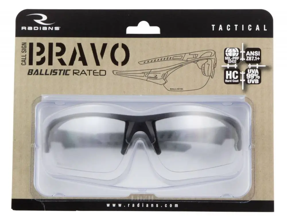 Radians' Protective Eyeware features Crossfire's High Definition (HD) Lens Technology which provides enhanced vision while the polarized lens technology prevents glare. Its frame utilizes materials that provides added durability and protection along with TPR technology which increases the grip to keep glasses on your face. The eyeware has polycarbonate lenses with 99.9 percent UV protection, ANSI Z87.1+ standards and a hard coat for scratch resistance. The Bravo glasses is ballistic rated and features a slick low profile frame with rubber tipped temples, dual lens and provides a solid, comfortable fit. It comes with a reusable protective eyewear clam. This model has a black frame finish with clear lens.