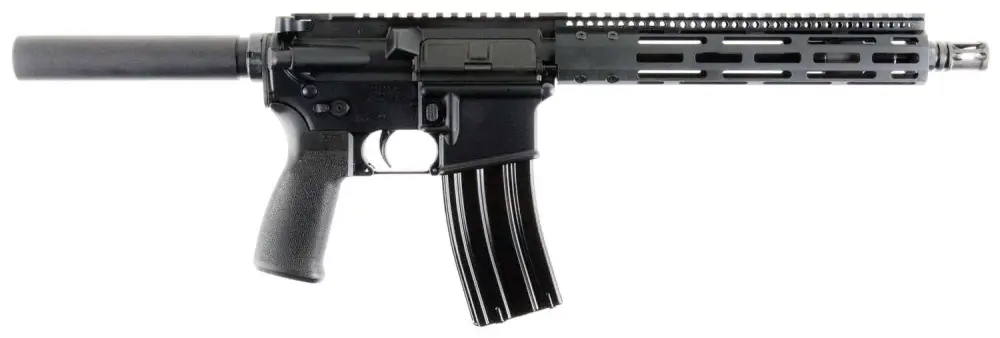 The Radical Firearms complete AR-Pistol is a fully Mil-Spec AR-15 pistol built using law enforcement grade upper receivers and mil spec lowers. The 4140 chromoly vanadium steel barrel is Melonite treated for a harder-than chrome finish. This same finish is applied to the bolt carrier groups, helping to reduce receiver wear and increase reliability. The bolt heads are MIL-STD and MPI for quality assurance. The full-length, free-float handguard keeps your hands cool and provides plenty of room for accessories. This model has a 10.5" barrel, Radical Firearms 10" FCR handguard with Magpul M-LOK slots on sides and bottom of the rail.