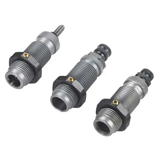 RCBS's Carbide 3-Die Set features a Carbide Sizer Die sizes the case and de-primes (the carbide sizer ring eliminates the need to lubricate). Its Expander Die expands the case to the proper diameter to accept the bullet, and it imparts case mouth flare/bell for bullet feeding. The Seater Die seats the bullet and roll crimps.