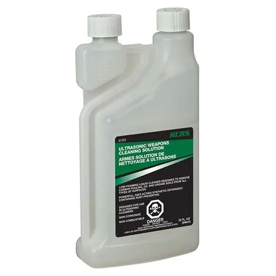 Designed for use with the RCBS Ultrasonic Case Cleaner, Ultrasonic Weapons Cleaning Solution quickly removes grease, carbon buildup and fouling from firearm parts. The fast-acting synthetic detergent cleans all part surfaces, and its rust preventive helps stop corrosion. Ultrasonic Weapons Cleaning Solution is easy to use, and its formulation is non-corrosive and non-combustible.