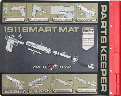 Clean your favorite handgun wherever you want with the 1911 Smart Mat. This mat offers you a cleaning surface that is large enough to handle a fully disassembled 1911 and instruction printed on the mat to get you there. An oil-resistant surface keeps counter tops and kitchen tables protected from chemicals and CLP. The attached parts tray ensures your pins, bolts and springs are never lost again.