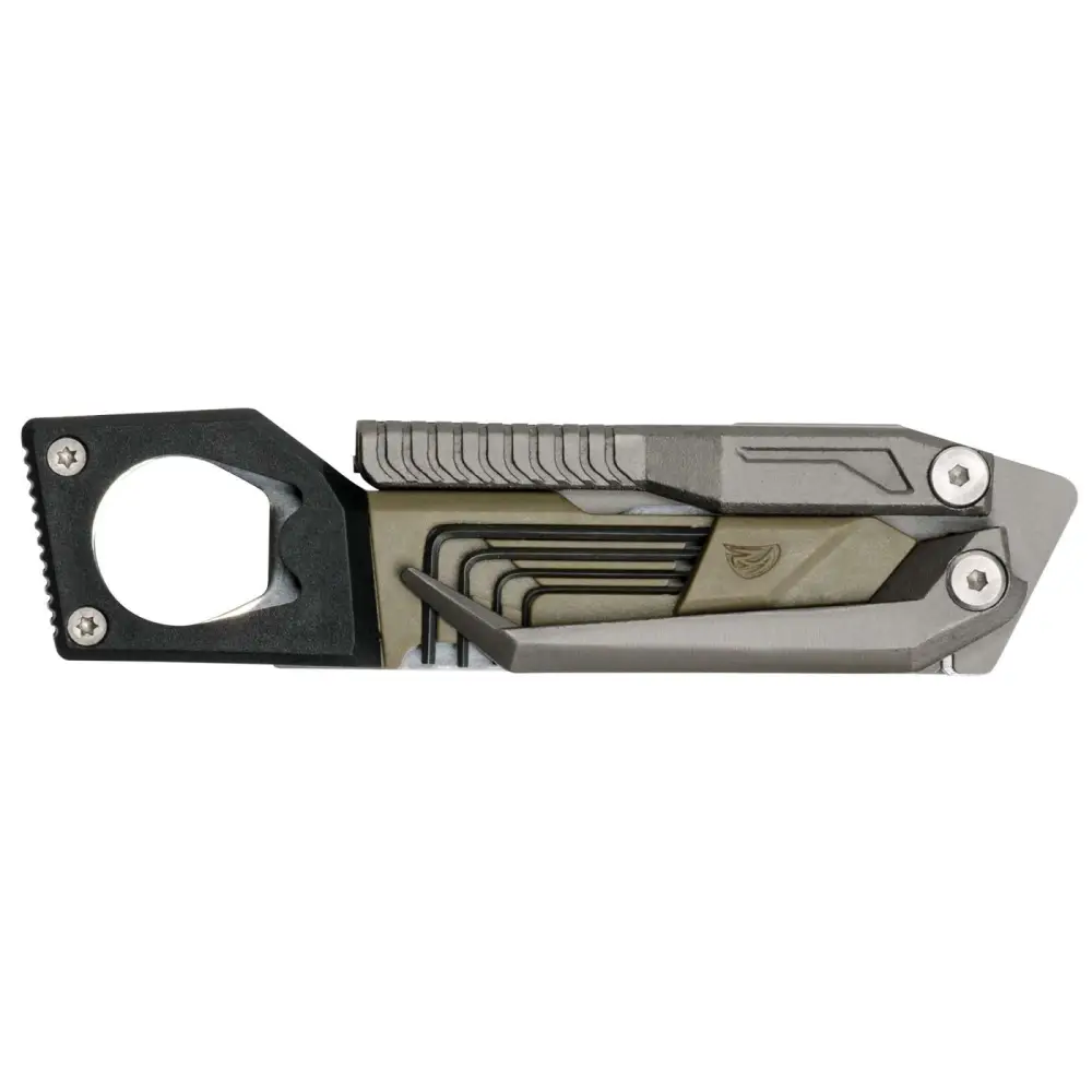 The Pistol Tool is ideal for mounting accessories, field disassembly, adjusting laser sights, and changing grips. The tool has a compact design that fits conveniently into most standard pistol mag pouches and each tool locks open. This pistol tool also has Titanium coated stainless steel components, 1911 government and officer bushing wrench, four Bondhus Protanium hex keys for laser sights, non-hardened stainless steel pick/scraper, 2.5" long bit driver, 3/32" pin punch with 8-32 threads, 3" tanto knife, 6 hex bits with ball detents, fine tooth metal file, and a tap hammer surface.