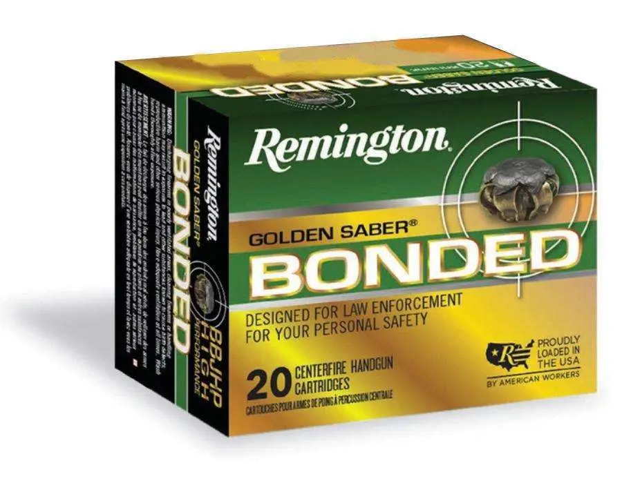 The Golden Saber Bonded features Remington's special bonded-bullet design, bringing unmatched expansion, weight-retention, and barrier-blind performance. The lead core is hot-bonded to brass jacket, while the reduced bullet nose diameter is ideal for precise bore alignment and match-grade accuracy. Jacket stiffness and wall thickness optimized to eliminate over-expansion.