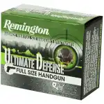Remington's line of Personal Defense ammunition is engineered to help you stop threats when everything depends on it. Ultimate Defense Full-Sized Handgun ammo uses a Golden Saber BJHP bullet which expands and penetrates for massive knockdown power. From bullets specially designed for controlled expansion and optimal energy transfer, to waterproofing and powders treated to reduce muzzle flash, its reliable stopping power stands ready for when you need it most.