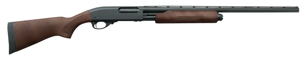 This 870 Express shotgun features a hardwood stock and forend, a black matte metal finish, a 25" vent rib barrel with a fixed full choke, twin action bars, and a front bead sight.