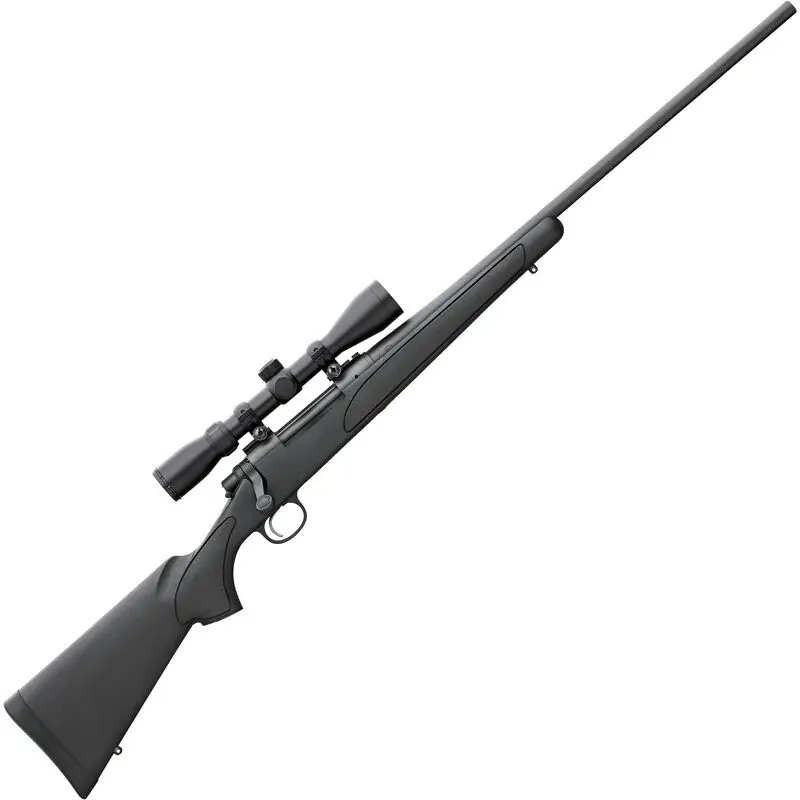 Remington's Model 700 bolt action rifle is known for its accuracy. This ADL model features a black synthetic stock with a blind box magazine and a matte blued carbon steel barrel. It includes a mounted and bore-sighted 3-9x40mm scope.