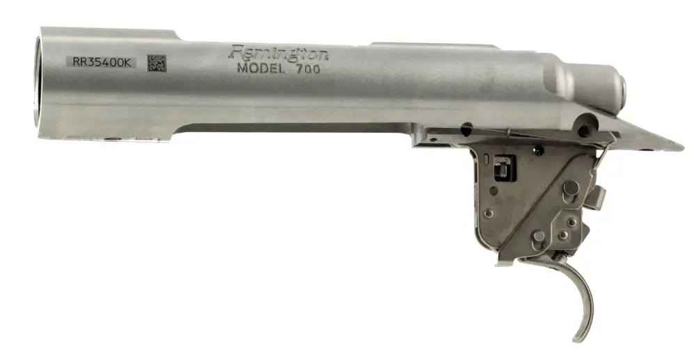 This is a remington model 700 short action 308 bolt face. It is stainless steel with an externally adjustable X Mark Pro trigger.
