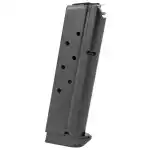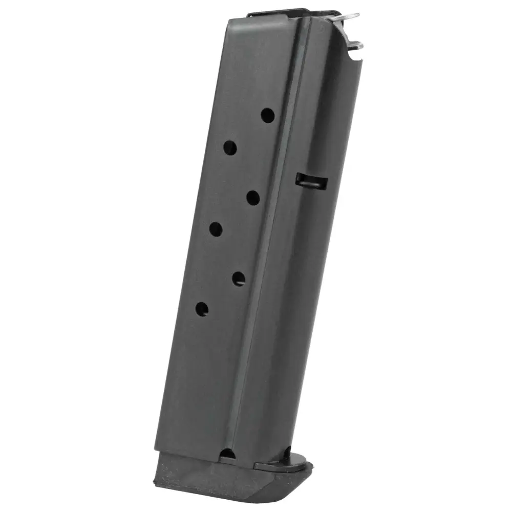 This magazine is for Rock Island's 1911 A1 pistol and is constructed of metal with a blued finish.