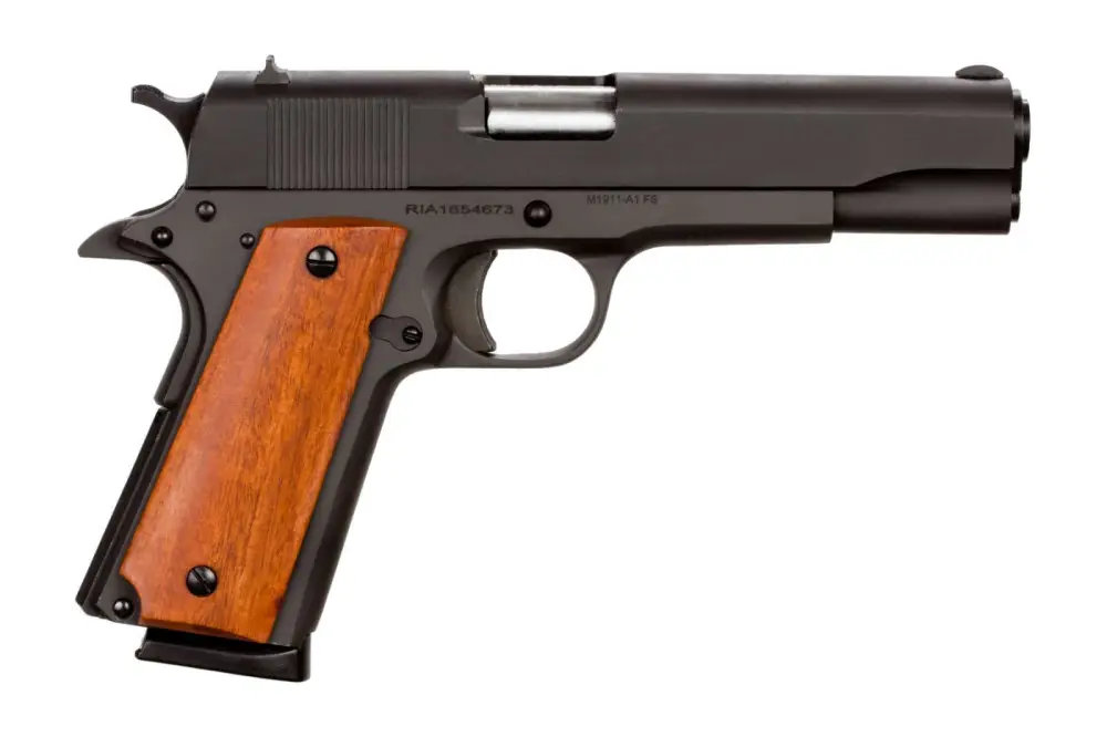 The M 1911 GI Standard FS has fixed, low profile sights and traditional smooth slim design that is ideal for quick pull holster use. A durable black parkerized finish gives it a tough, smooth, non-reflective surface. The smooth wood grips offer comfort in both feel and design. The 5" barrel offers a balanced weight to assist with the accuracy and recoil.