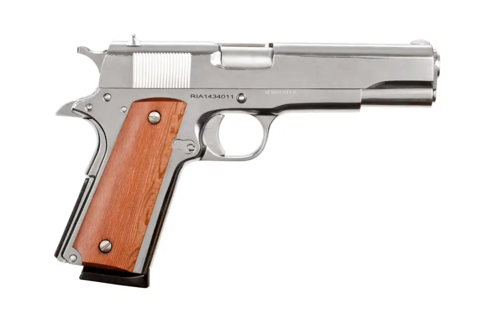 The M 1911 GI Standard FS has fixed, low profile sights and traditional smooth slim design that is ideal for quick pull holster use. A bright nickel finish is perfect for those who want a glossy, durable look and feel. The smooth wood grips offer comfort in both feel and design. The 5" barrel offers a balanced weight to assist with the accuracy and recoil.