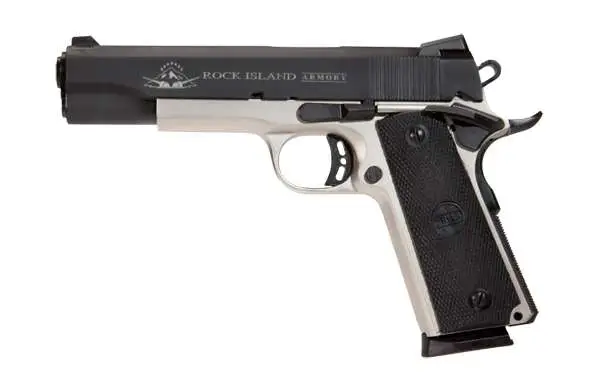 The Rock Standard FS 2-Tone has a 5" button rifled barrel supported by a full length guide rod. The smooth-angled, snag-free style allows for quick draw in fast need situations. Includes a low profile angled rear sight along with skeletonized hammer and trigger with adjustable over travel stop and ambidextrous safety. Built in a 2-tone blasted nickel finish on the frame and parkerized finish on the slide offers a custom-design aspect and comes with checkered rubber grips.