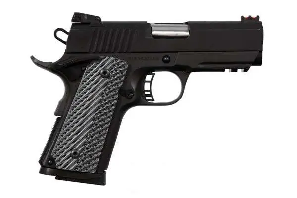 The TAC Ultra CS has a full tactical rail. This pistol has a 3.5" button rifled barrel supported by a full length guide rod and full dust cover. Includes a low-profile adjustable rear sight and high-visibility fiber optic front sight. Also fitted with a skeletonized hammer and trigger with adjustable over travel stop. The TAC Ultra is finished with a tough parkerzied matte coating and has battle ready G10 tactical grips.