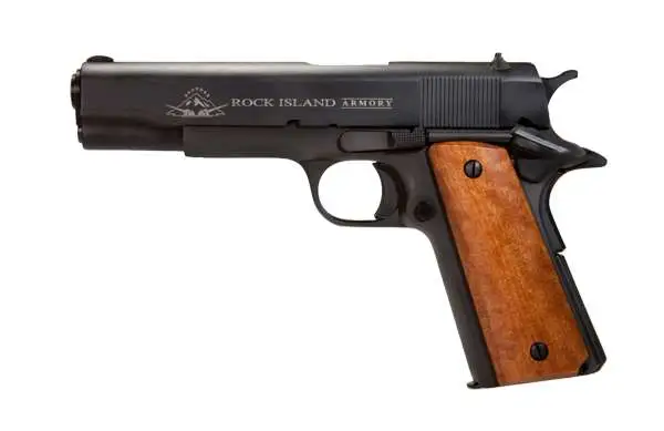 The M 1911 GI Standard FS has fixed, low profile sights and traditional smooth slim design that is ideal for quick pull holster use. A durable black parkerized finish gives it a tough, smooth, non-reflective surface. The smooth wood grips offer comfort in both feel and design. The 5" barrel offers a balanced weight to assist with the accuracy and recoil.