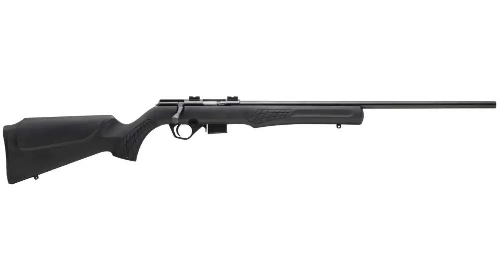 Rossi's RB22 bolt action features a free-float, button-rifled barrel, synthetic Monte Carlo stock, and a detachable magazine. This 17HMR model has a black finish, 21" barrel, and Weaver scope mount.