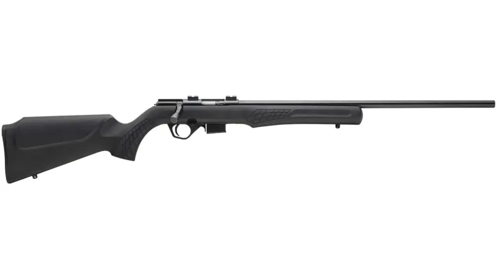 Rossi's RB22 bolt action features a free-float, button-rifled barrel, synthetic Monte Carlo stock, and a detachable magazine. This 22WMR model has a black finish, 21" barrel, and Weaver scope mount.