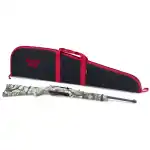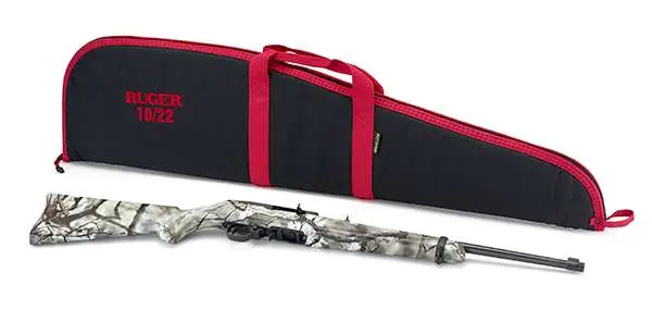 Ruger's 10/22 Carbine's legendary action, is a tried and true Ruger design, and ensures consistent, reliable performance. Its cold hammer-forged barrel is locked into the receiver by a unique, two-screw, V-block system. The easy-to-use extended magazine release provides smooth, no-fuss removal of flush-mounted magazine. The 10/22 Carbine also utilizes a cross-bolt safety, polymer trigger housing assembly, detachable rotary magazine and includes a combination scope base adapter for both Weaver-style and .22 tip-off scope mounts. This model features a 18.5" barrel with black finish and a synthetic stock with GO Wild Camo Rock Star. It includes a 40" soft-sided rifle case with red trim and embroidery.