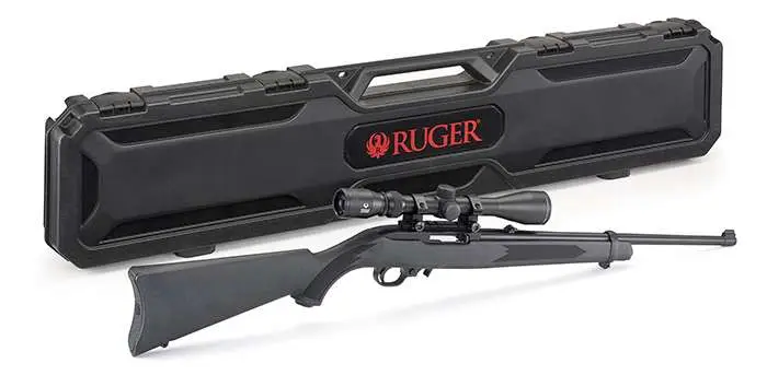 This Ruger 10/22 Carbine features a black synthetic stock, heat-stabilized, glass filled, polymer trigger housing assembly, and cold hammer-forged barrel that is locked into the receiver by a two-screw V-block system. It also features a factory mounted Viridian EON 3-9x40 scope, and includes a detachable 10-round rotary magazine.