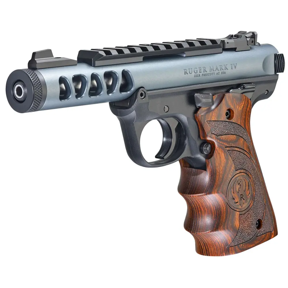 Ruger's Mark IV features a simple, one-button takedown for quick and easy field-stripping and proper chamber to muzzle cleaning. The recessed button in the back of the frame allows the upper receiver to tilt up and off of the grip frame without the use of tools. Its internal cylindrical bolt construction ensures permanent sight to barrel alignment, while the contoured ejection port and easy-to-grasp bolt ears allow for durable and reliable operation. The accurate sighting system features a drilled and tapped receiver for Weaver- or Picatinny-style rail. The Mark IV is a single action and utilizes an ambidextrous manual safety, push-button magazine release located on the left side, and an ergonomic bolt stop. Included is a washer and two magazines. This 22/45 Lite model features an aerospace-grade aluminum, ventilated receiver with a diamond gray anodized finish. It also has a 4.4" barrel, black polymer grip frame, laminate wood target grip, and a fixed front sight with an adjustable rear.