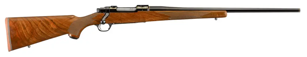 Ruger's Hawkeye M77 50th Anniversary Rifle has a non-rotating, Mauser-type controlled round feed extractor which features a fixed blade-type ejector that positively ejects the empty cases as the bolt is moved fully rearward. The cold hammer-forged barrel results in ultra-precise rifling which provides exceptional accuracy, longevity and easy cleaning. It also has a three-position safety. The 50th Anniversary model features a high-grade walnut stock and satin blued finish. This compact and quick-handling rifle is easy to carry and quick to shoulder. It also features custom "M77 50 Years" engravings on both the bolt handle and floorplate. The included scope rings come packaged in a red felt bag as they did 50 years ago with the original rifles.