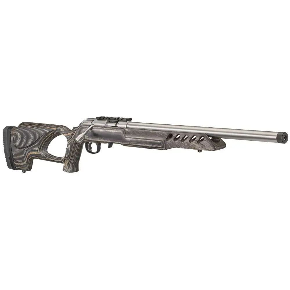 Ruger's American Rimfire rifle features a patent-pending Power Bedding integral bedding block system which positively locates the receiver and free-floats the barrel for outstanding accuracy. The cold hammer-forged barrel results in ultra-precise rifling which provides exceptional accuracy, longevity and easy cleaning. The American Rimfire rifle also has a Ruger Marksman Adjustable trigger, tang safety, easy-to-use 10/22-style extended magazine release, and a 3/8" rimfire scope base that is machined into the receiver, which is also drilled and tapped. This model has an 18" threaded barrel, black laminate stock with thumbhole and adjustable LOP, and a detachable, flush-mounted 10/22 BX-1 rotary magazine.