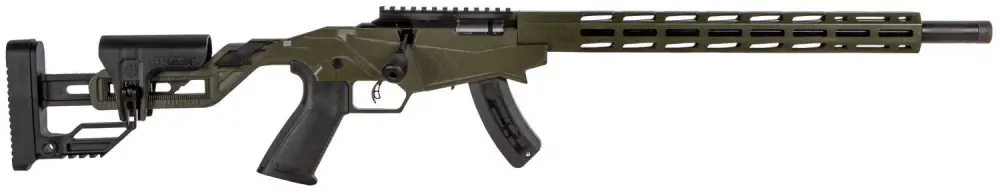 Ruger's Precision Rimfire rifle features a molded, one-piece chassis and a Quick-Fit adjustable buttstock assembly manufactured with glass-filled nylon for strength, stiffness and stability, making a solid foundation. The adjustable buttstock also has a flat Picatinny bag rider, molded-in window which provides a tether point for your squeeze bag, and a metal QD pocket. Its 15" free-float handguard is made of aluminum and features Magpul M-Lok slots on all four sides, while the Picatinny scope base includes 30 MOA elevation. The target, cold hammer-forged, 4140 alloy steel barrel has ultra precise rifling. The Precision Rimfire rifle also has a Ruger Marksman adjustable trigger, AR-pattern pistol grip, safety selector, and an oversized bolt handle.