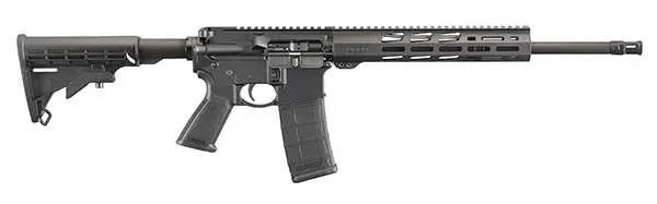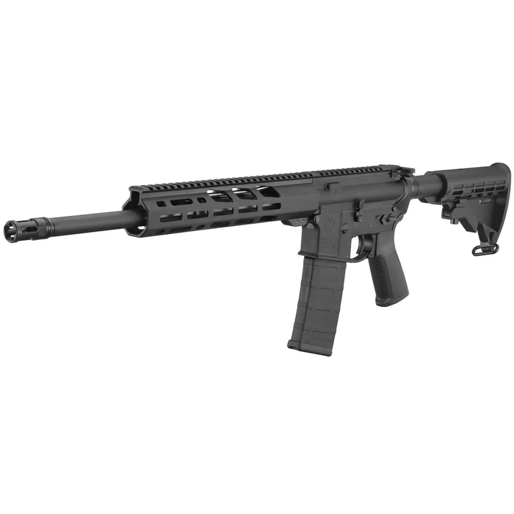 This Ruger AR-556 semi-automatic rifle is made from forged aerospace-grade 7075-T6 aluminum. The hard coat anodized, flattop upper receiver includes a forward assist, dust cover and brass deflector, while the Magpul M-Lok handguards are made from heat-resistant glass-filled nylon. It also has a bolt machined from 9310 alloy steel, single-stage trigger, chrome-plated bolt carrier with a matte black oxide finish on the exterior. The AR-556 also utilizes a heavy contour, cold hammer-forged barrel and ergonomic pistol grip.