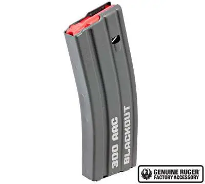 Black steel, 30-round magazine for the Ruger SR-556 Takedown rifle chambered in 300 Blackout. '300 AAC Blackout' is lasered on the side of the magazine.