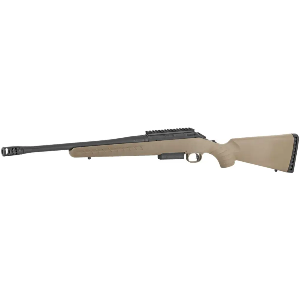 The Ruger American Ranch offers minute-of-angle accuracy that can make every hunt a success. The ergonomic, lightweight synthetic stock designed for quick, easy handling blends a classic look with modern forend contouring and grip serrations with a soft rubber buttpad for maximum recoil reduction. The one-piece, three-lug bolt with 70 degree throw provides ample scope clearance and utilizes a full diameter bolt body and dual cocking cams for smooth, easy cycling from the shoulder. Patented Power Bedding, integral bedding block system positively locates the receiver and free-floats the barrel for while the Marksman Adjustable trigger offers a crisp release with a pull weight that is user adjustable between 3 and 5 pounds. Features a compact, cold hammer-forged, threaded barrel with factory installed Ruger Hybrid Muzzle Brake; visible, accessible and easy-to-actuate tang safety provides instant security and a factory-installed, one-piece Picatinny scope base. Includes one Single Stack magazine and sling swivel studs.