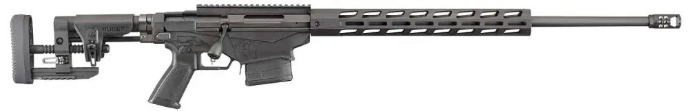Ruger's Precision Rifle features an in-line recoil path which manages recoil directly from the rear of the receiver to the buttstock, providing maximum accuracy potential. The Ruger Precision MSR stock comes with QD sling attachment points and features a bottom Picatinny rail and soft rubber buttpad. Its left-folding stock hinge is attached to an AR-style buffer tube and accepts any AR-style stock. The length of pull and comb height are adjustable. Its 15" free-float M-Lok handguard is made of aluminum and features M-Lok slots on all four sides, while the receiver and one-piece bolt are precision CNC-machined from pre-hardened 4140 chrome-moly steel. The 20 MOA Picatinny rail is ideal for increased long-range elevation capabilities. The cold hammer-forged chrome-moly steel barrel features 5R Rifling, medium-contour, and a Ruger Precision Rifle Hybrid Muzzle Brake along with an included thread protector. The Precision Rifle also has a Ruger Marksman adjustable trigger, ambidextrous manual safety, magazine well front that is contoured and precision machined from aerospace-grade 7075-T6 aluminum, and patented multi-magazine interface functions. This 6mm Creedmoor model has a 24" barrel and includes two 10-round Magpul PMAG magazines.