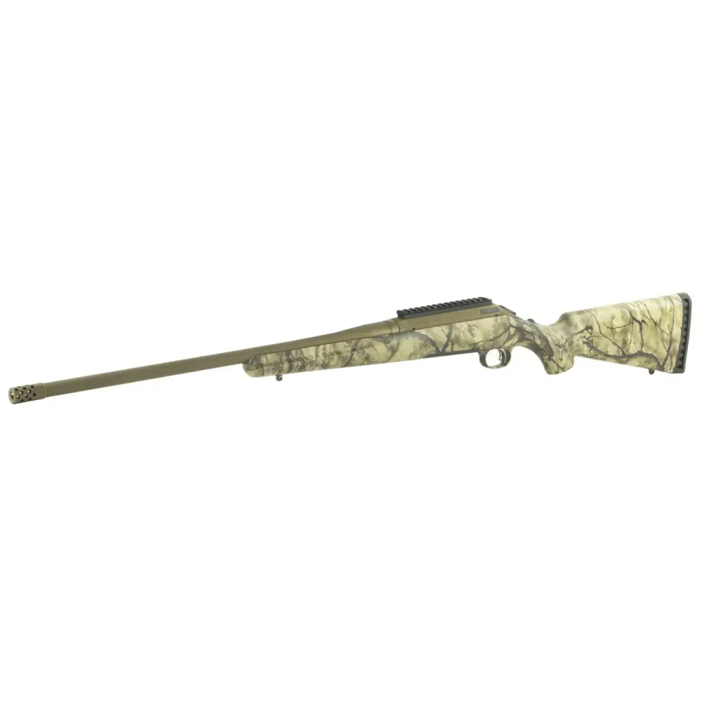 Ruger's American Rifle offers minute-of-angle accuracy that can make every hunt a success. The one-piece, three-lug bolt with 70 degree throw provides ample scope clearance and utilizes a full diameter bolt body and dual cocking cams for smooth, easy cycling. Its patent-pending Power Bedding, integral bedding block system positively locates the receiver and free-floats the barrel for outstanding accuracy. The ergonomic, lightweight synthetic stock with soft rubber buttpad is designed for quick, easy handling and blends a classic look with modern forend contouring and grip serrations. The American Rifle also has a Ruger Marksman adjustable trigger, cold hammer-forged barrel, and a tang safety. This Standard model is chambered in 30-06 Springfield and has a 22" cerakote bronze barrel and a Go Wild IM Brush camo synthetic stock.