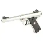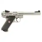 Ruger's Mark IV features a simple, one-button takedown for quick and easy field-stripping and proper chamber to muzzle cleaning. The recessed button in the back of the frame allows the upper receiver to tilt up and off of the grip frame without the use of tools. Its internal cylindrical bolt construction ensures permanent sight to barrel alignment, while the contoured ejection port and easy-to-grasp bolt ears allow for durable and reliable operation. The accurate sighting system features a drilled and tapped receiver for Weaver- or Picatinny-style rail. The Mark IV is a single action and utilizes an ambidextrous manual safety, push-button magazine release located on the left side, and an ergonomic bolt stop. Included is a washer and two magazines.