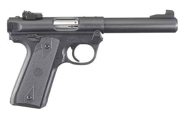 Ruger's Mark IV features a simple, one-button takedown for quick and easy field-stripping and proper chamber to muzzle cleaning. The recessed button in the back of the frame allows the upper receiver to tilt up and off of the grip frame without the use of tools. Its internal cylindrical bolt construction ensures permanent sight to barrel alignment, while the contoured ejection port and easy-to-grasp bolt ears allow for durable and reliable operation. The accurate sighting system features a drilled and tapped receiver for Weaver- or Picatinny-style rail. The Mark IV is a single action and utilizes an ambidextrous manual safety, push-button magazine release located on the left side, and an ergonomic bolt stop. Included is a washer and two magazines. This 22/45 model features a 5.5" bull barrel, polymer grip frame, blued metal finish, black synthetic grip, and a fixed front sight with an adjustable rear.