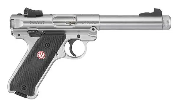 Ruger's Mark IV features a simple, one-button takedown for quick and easy field-stripping and proper chamber to muzzle cleaning. The recessed button in the back of the frame allows the upper receiver to tilt up and off of the grip frame without the use of tools. Its internal cylindrical bolt construction ensures permanent sight to barrel alignment, while the contoured ejection port and easy-to-grasp bolt ears allow for durable and reliable operation. The accurate sighting system features a drilled and tapped receiver for Weaver- or Picatinny-style rail. The Mark IV is a single action and utilizes an ambidextrous manual safety, push-button magazine release located on the left side, and an ergonomic bolt stop. Included is a washer and two magazines.